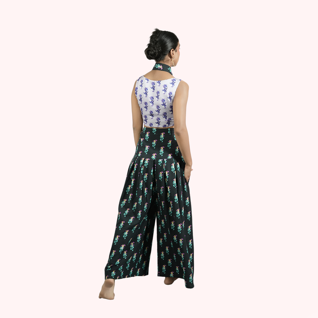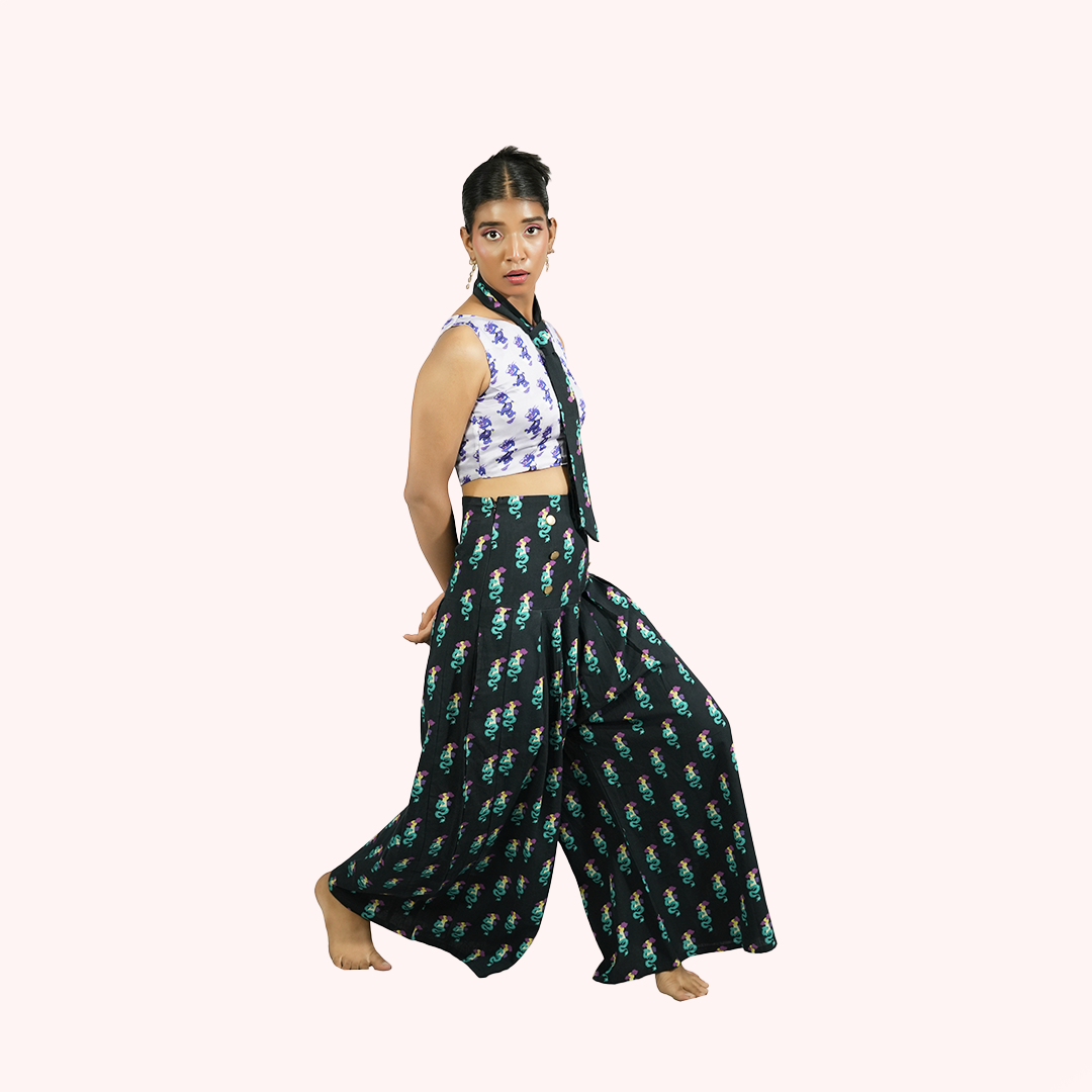 Pant Fit: Loose, relaxed fit with ample fabric for flow and movement, fitting the classic wide leg pant style