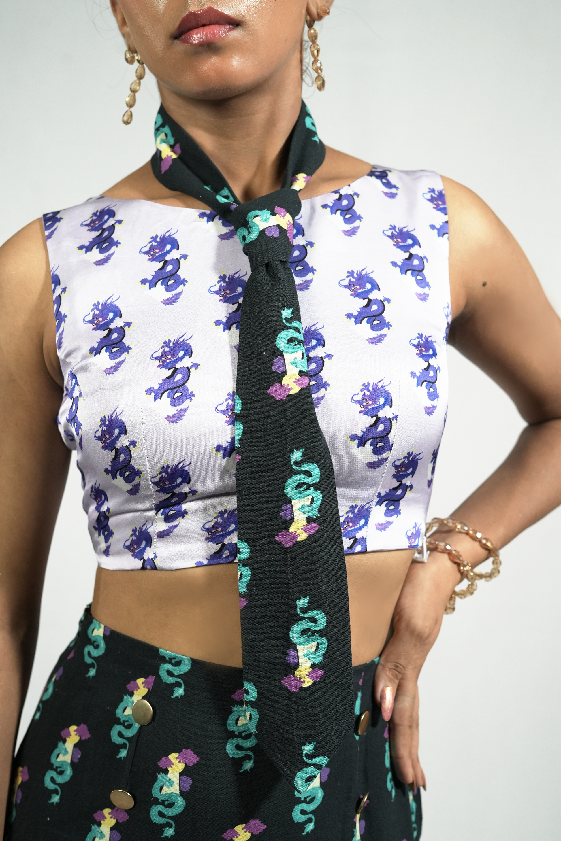 Striking purple dragon motif for standout aesthetic . Crop length design for a flattering fit Soft and comfortable fabric, Perfect for festivals, casual outings, or statement outfits Easy to pair with high waisted pants, skirts, or festival gear.