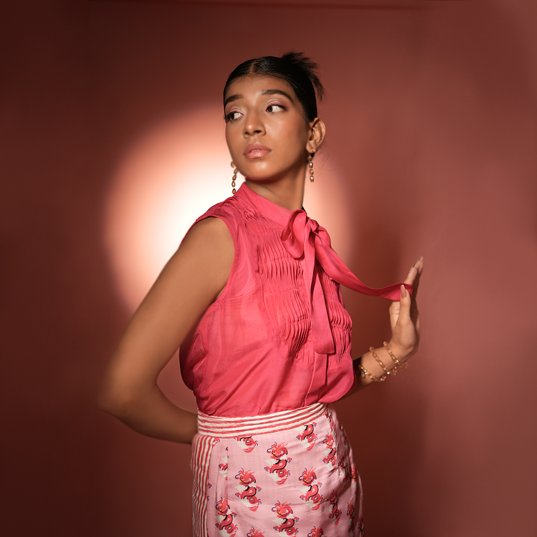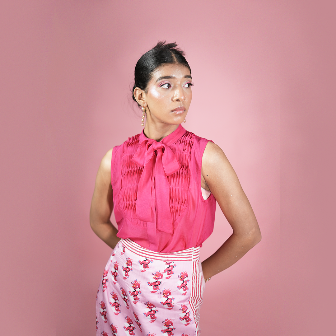 A classic Magenta sheer shirt with pin tucks, a collar, and a bow is a sophisticated garment that blends elegance with detailing. This stylish shirt features semi-transparent, lightweight fabric, vertical pin tuck accents down the front for texture, a structured collar, and a bow tie at the neckline for a feminine touch.